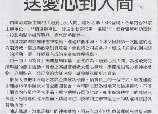 中國時報2014年01月17日 04:09  文/黃繡鳳 由精湛建設主辦的「送愛心到人間」尾牙活動,8日登場,今年結合25家主辦單位、125個協辦單位,計送出七部汽車、電腦3C、健身醫療輔助器材、投影和點字機等獎品,嘉惠弱勢團體。精湛建設總經理陳志聲
